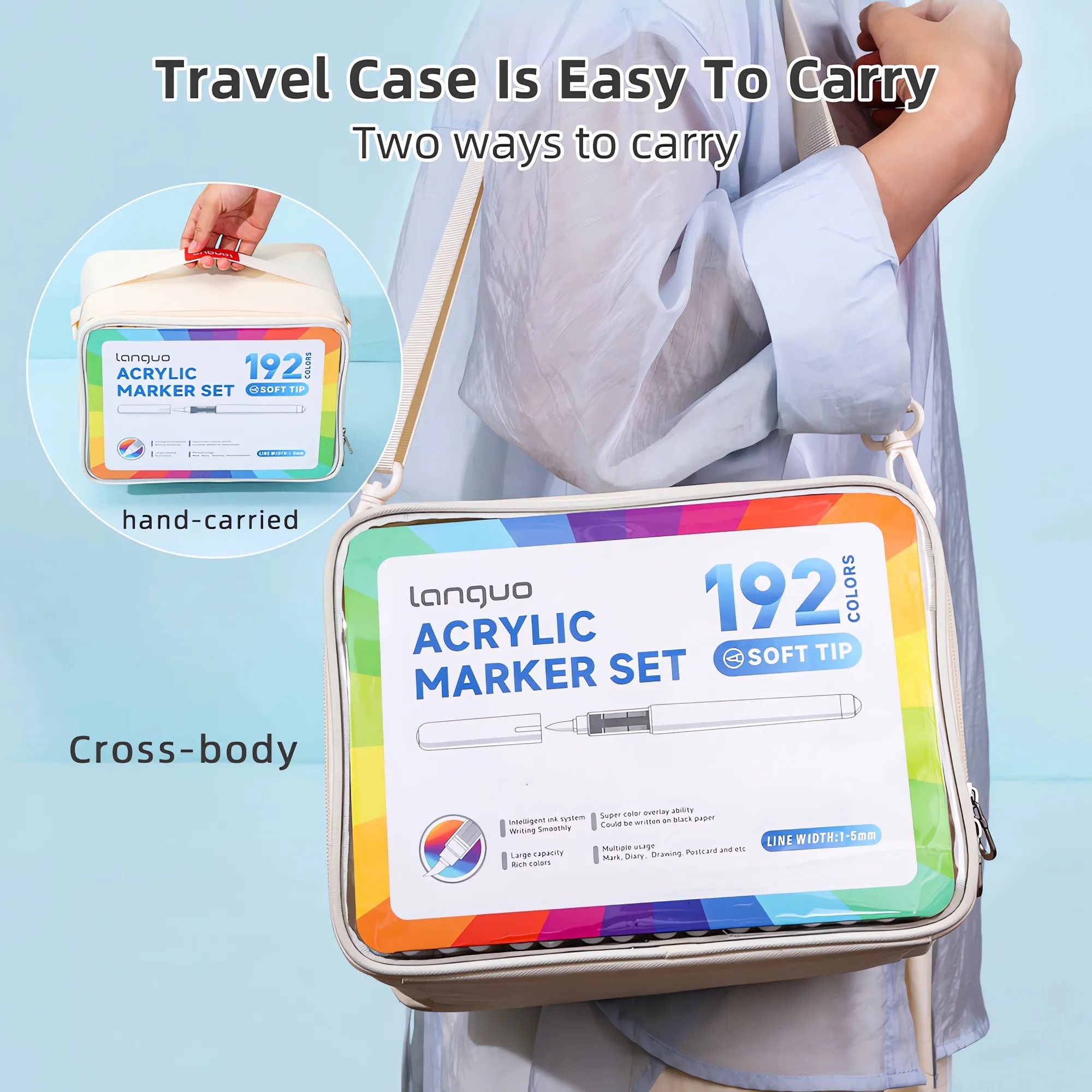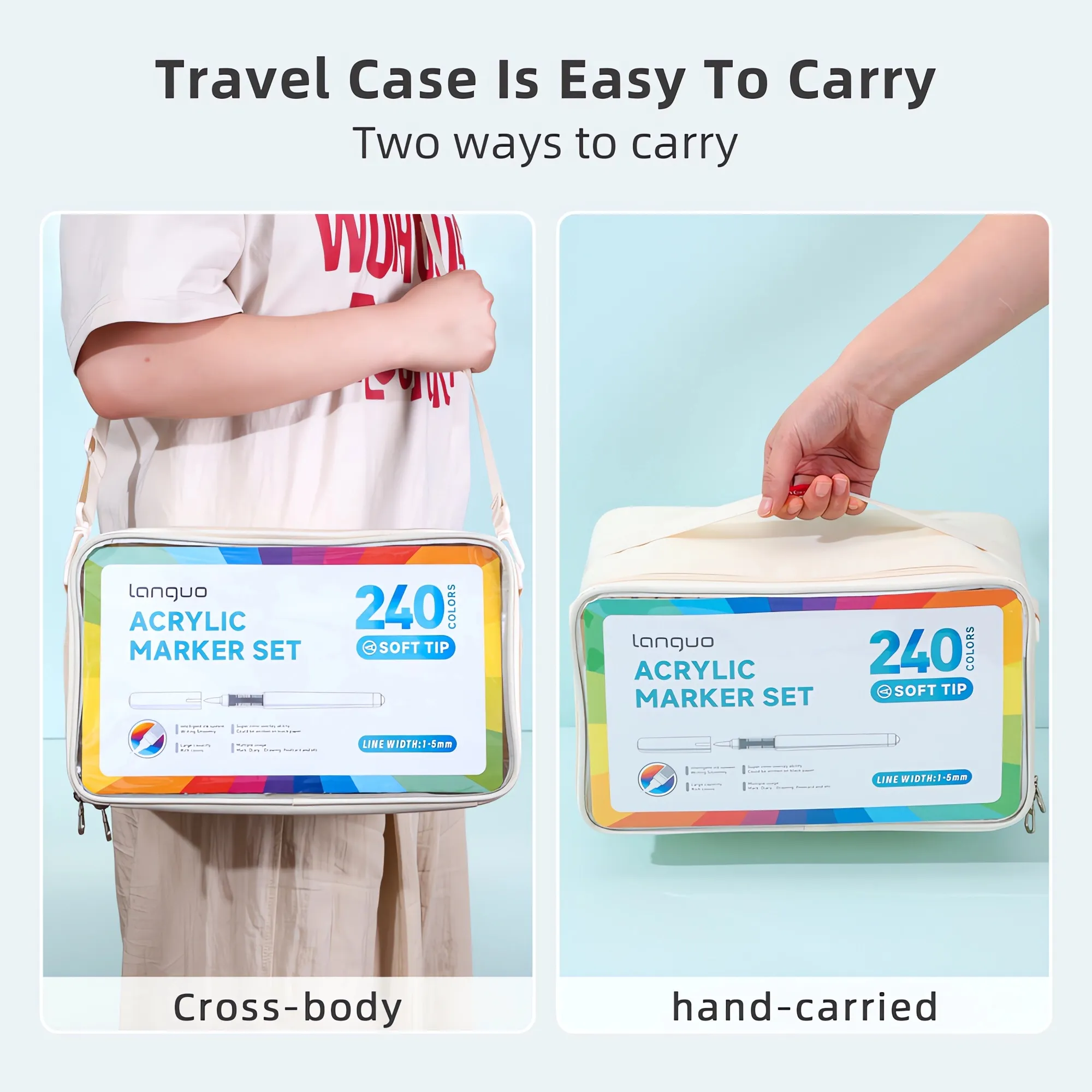 LanGuo 96-240 Color Acrylic Paint Markers Set – Soft Brush Tip Paint Pens – Liquid Ink System – Marker Bag for Fabric Wood Glass DIY