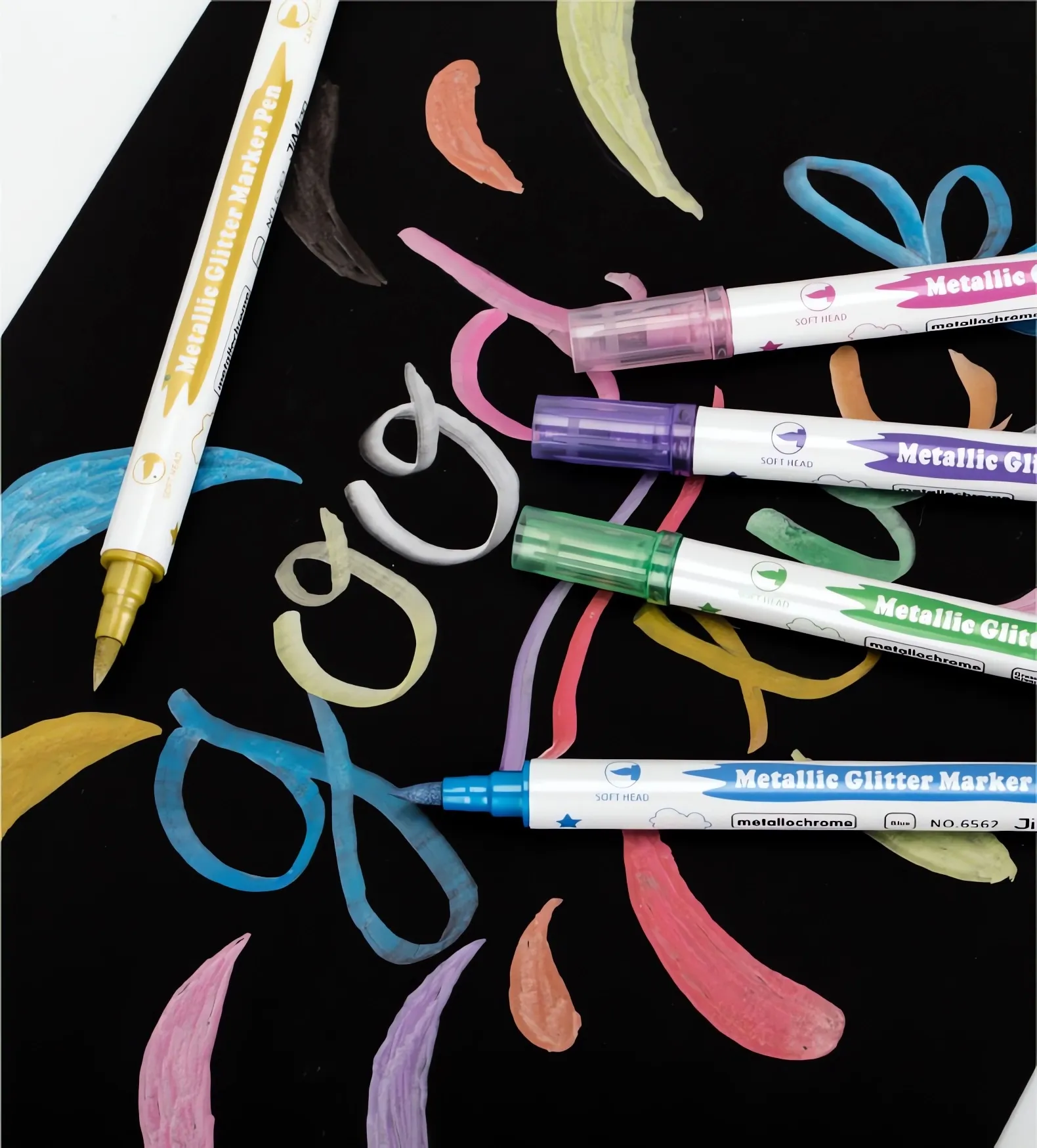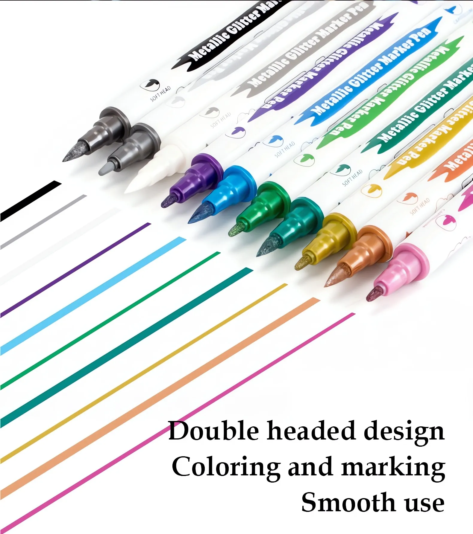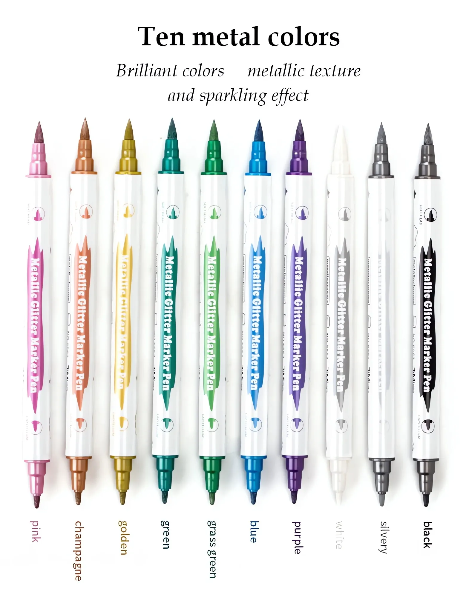 Double-headed metallic markers – soft brush tip for calligraphy and fast fills – fine tip for outlining and journaling – 10 shiny colors.