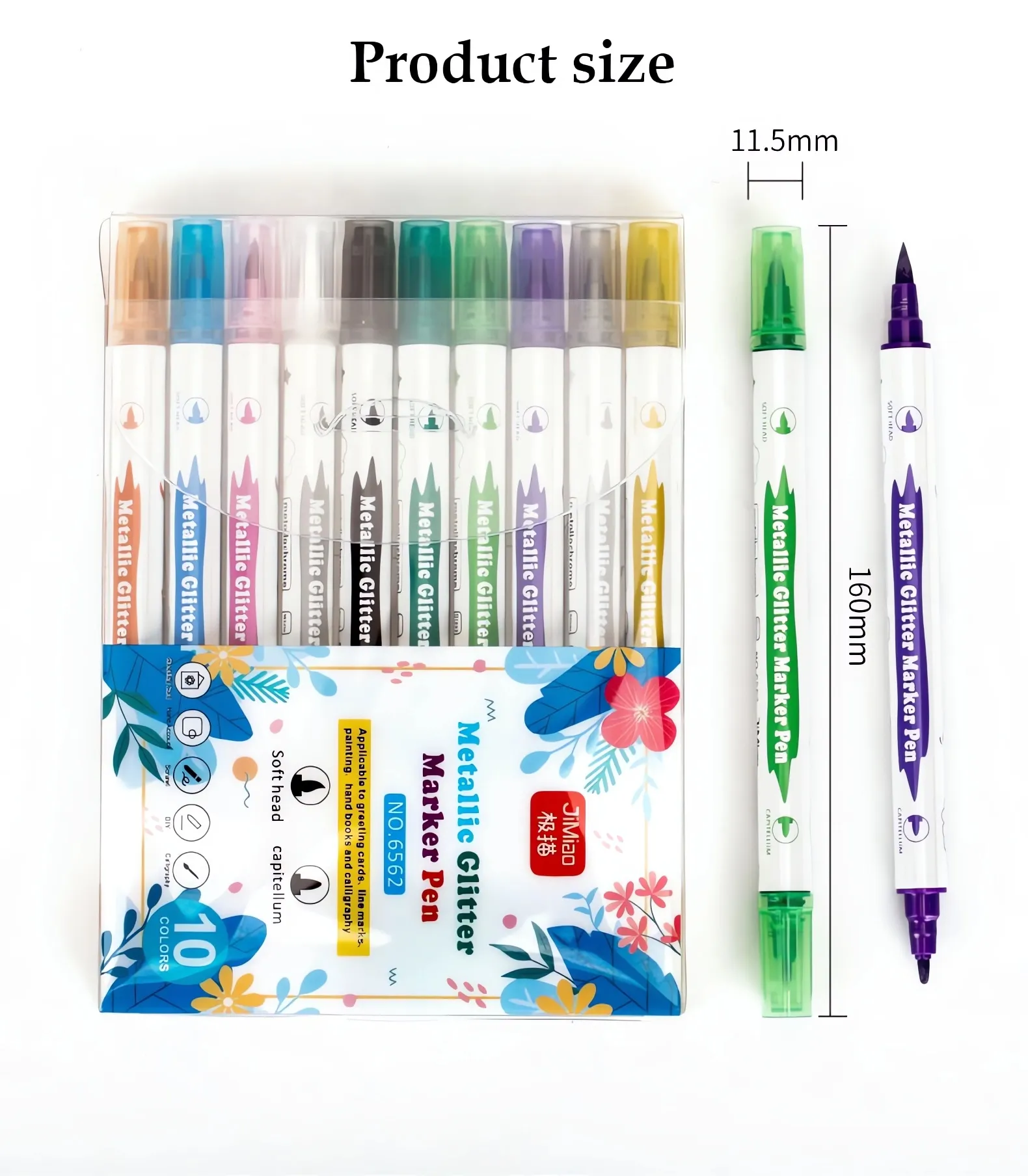 JiMiao Double-Headed Metallic Markers Set – Soft Brush & Fine Tip – 10 Shimmer Colors