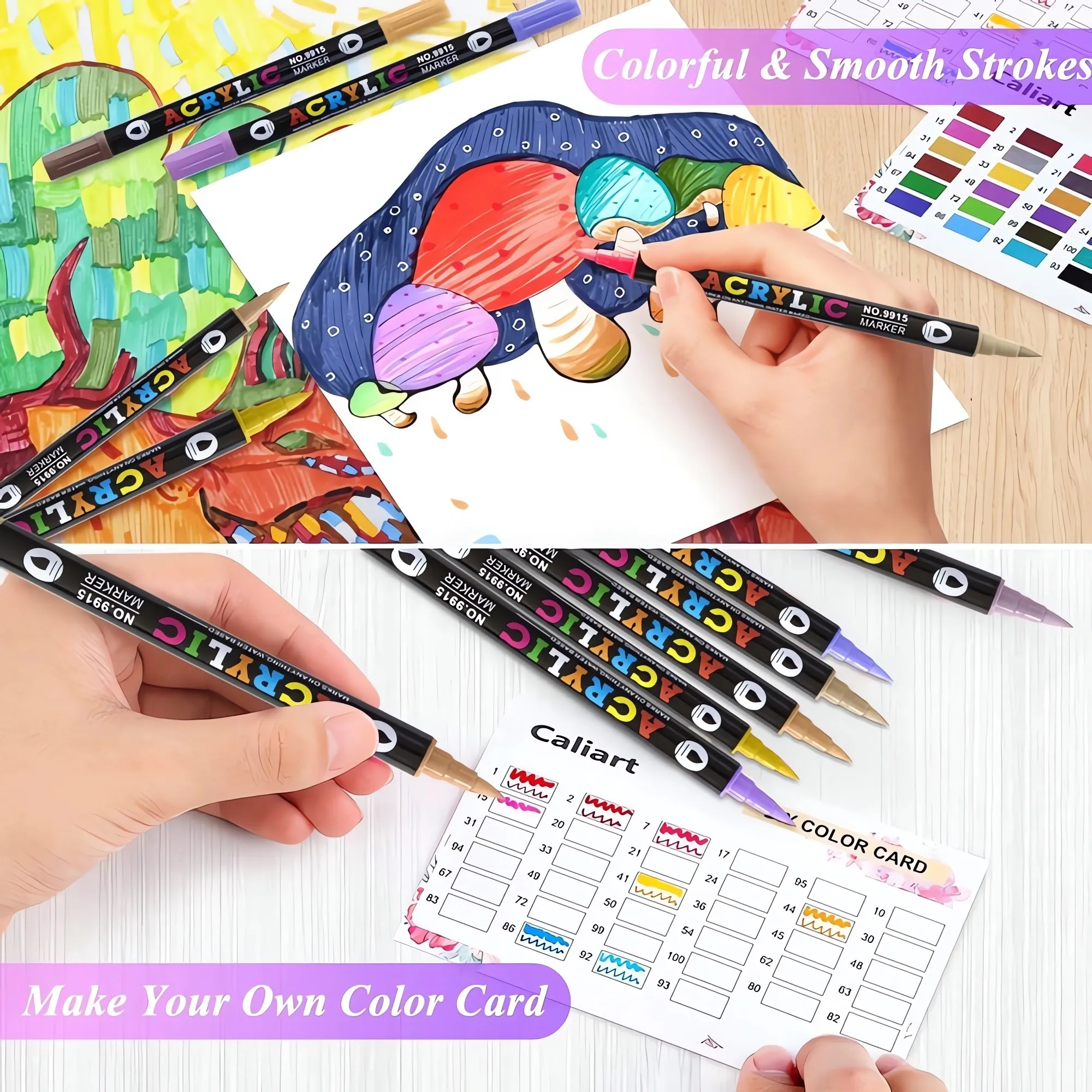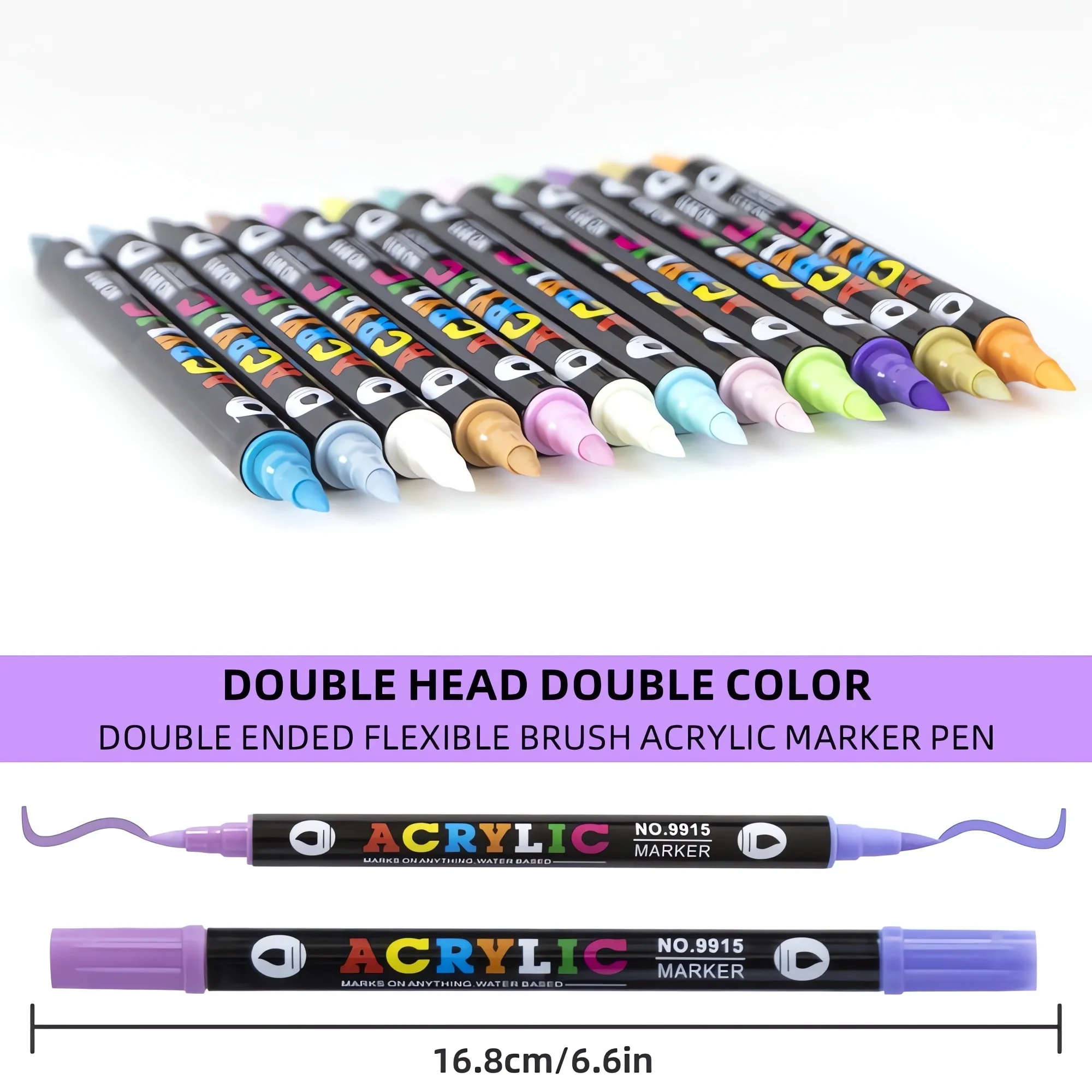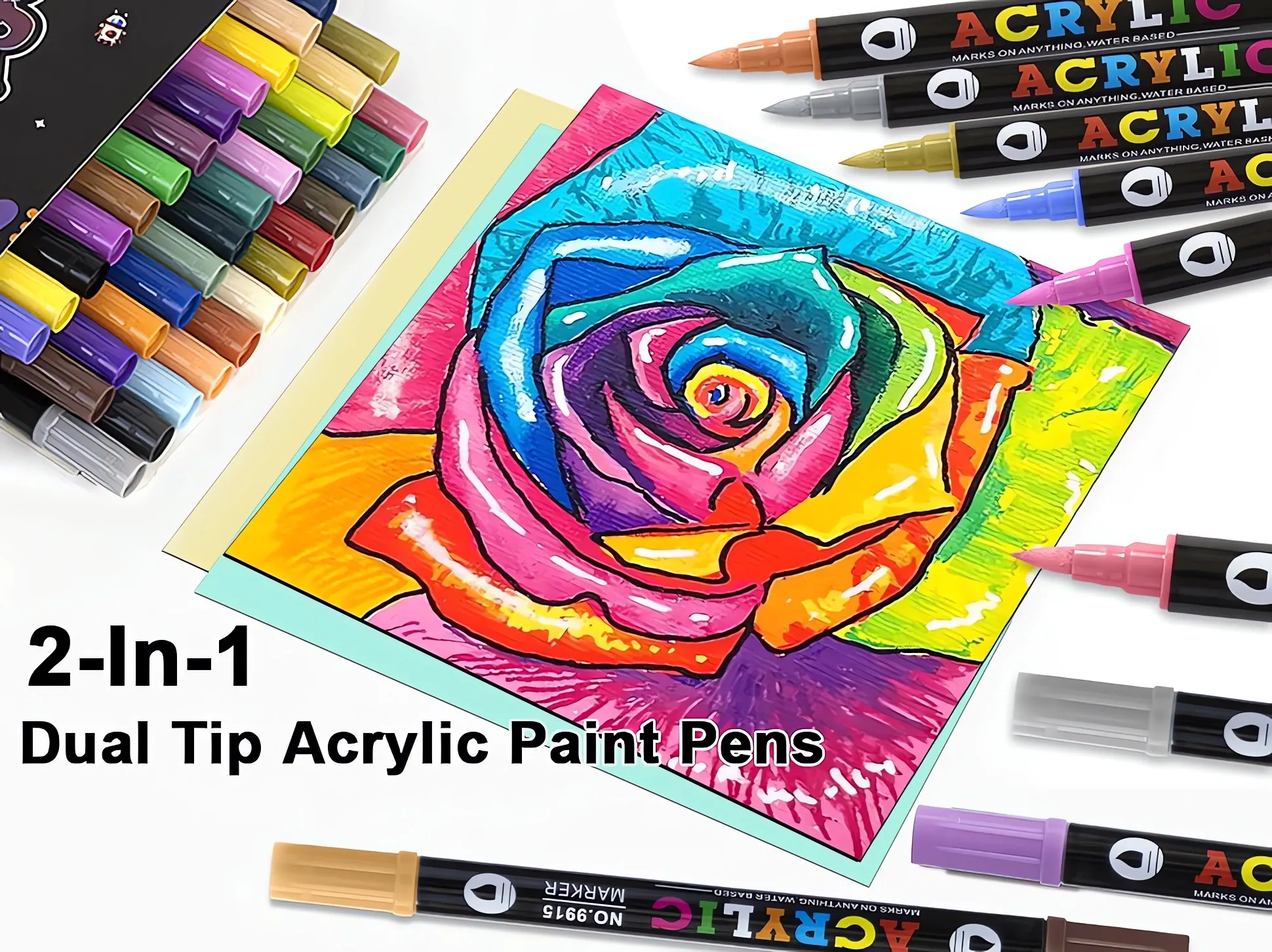 Dual-tip acrylic paint markers – two colors in one – water-based ink – soft brush tips – vivid coverage on stone, glass, wood, ceramics.