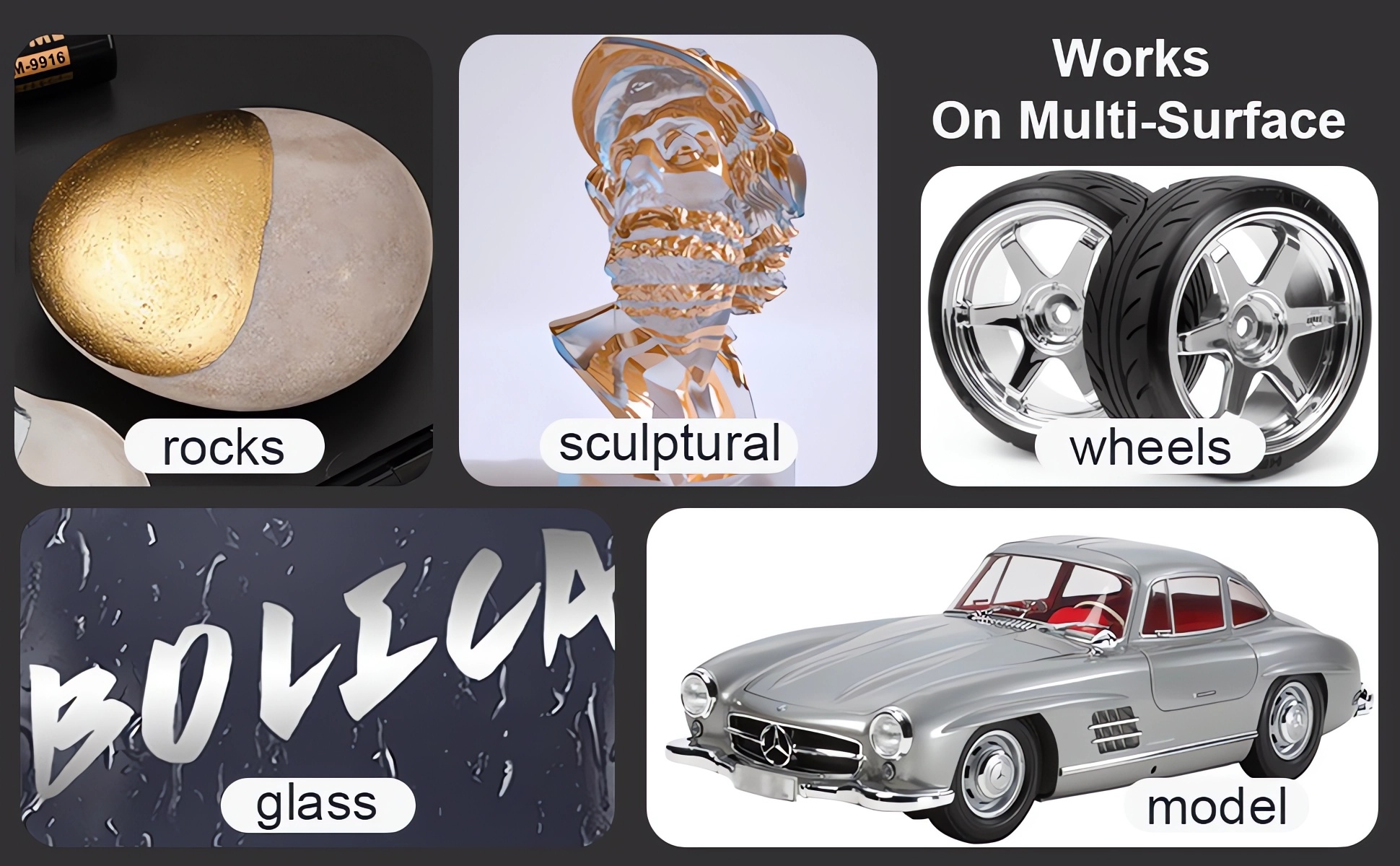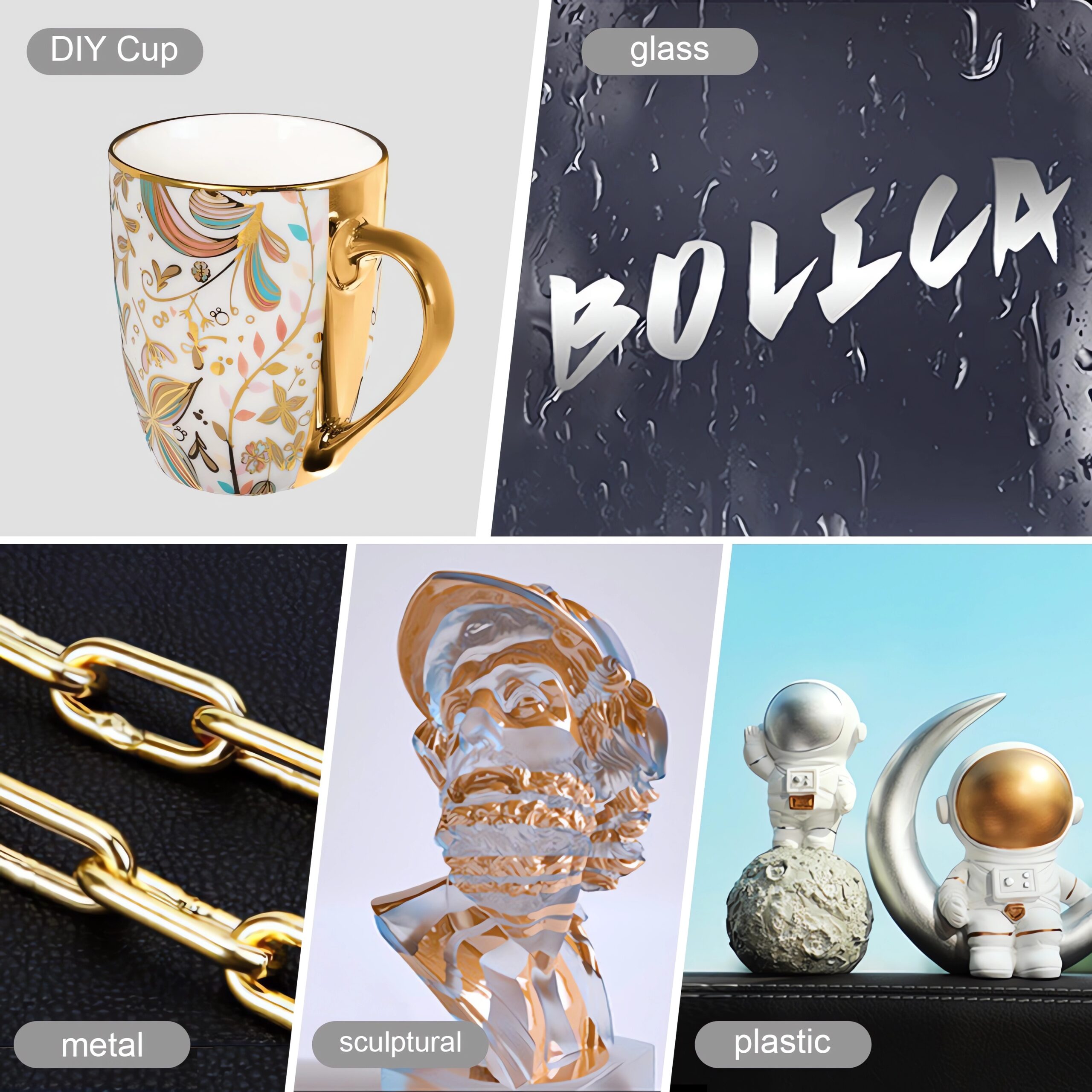 Mirror-chrome silver and metallic gold – strong coverage – waterproof on smooth, nonporous surfaces – air-dry to high gloss – avoid touching wet ink