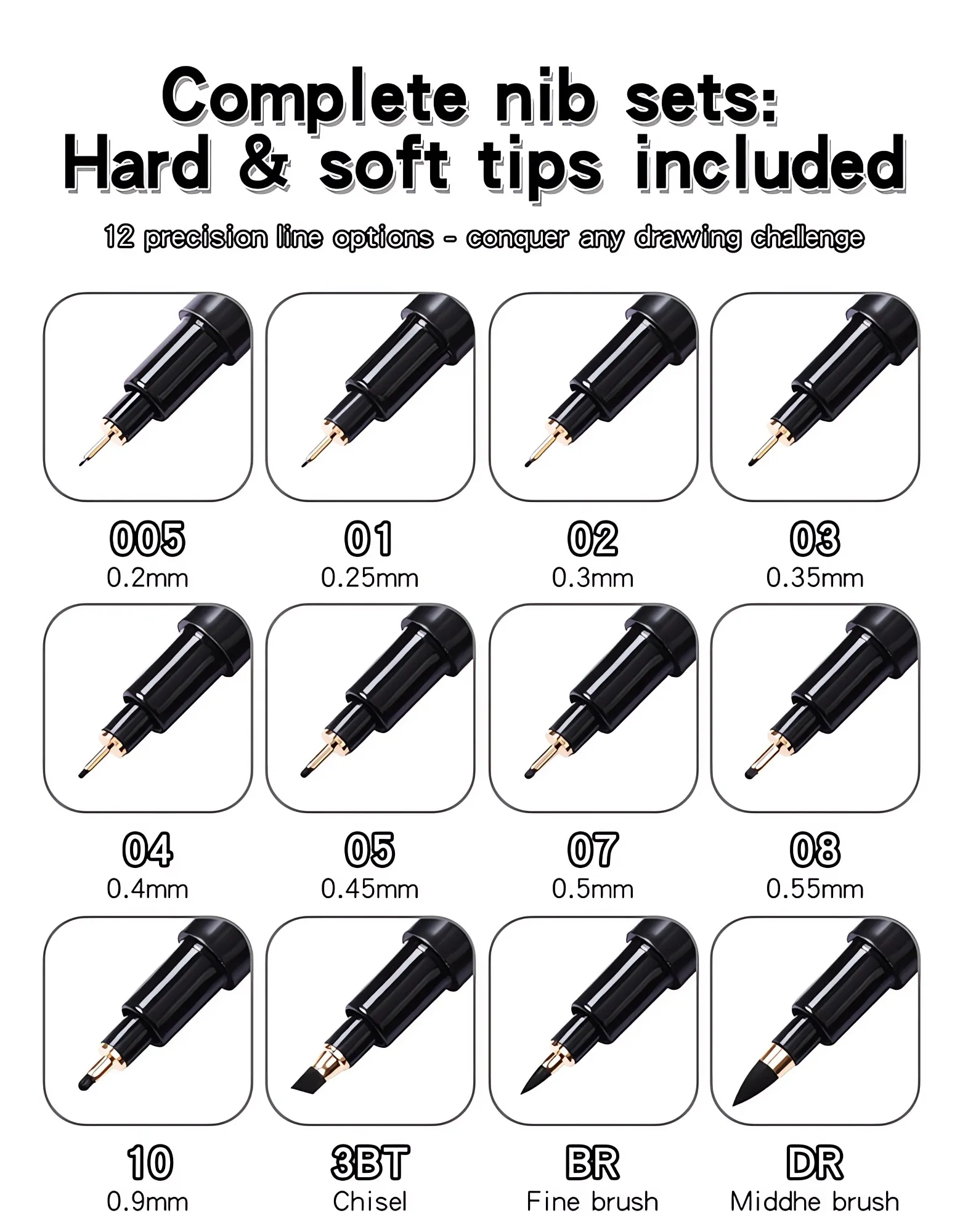 12 micro fineliners 0.2–0.9mm + brush — waterproof ink for sketching, manga, journaling & drafting