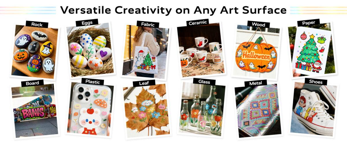 - Works on Multi-Surfaces – Paint on rock, glass, fabric, wood, metal, ceramics, canvas, and seasonal surfaces